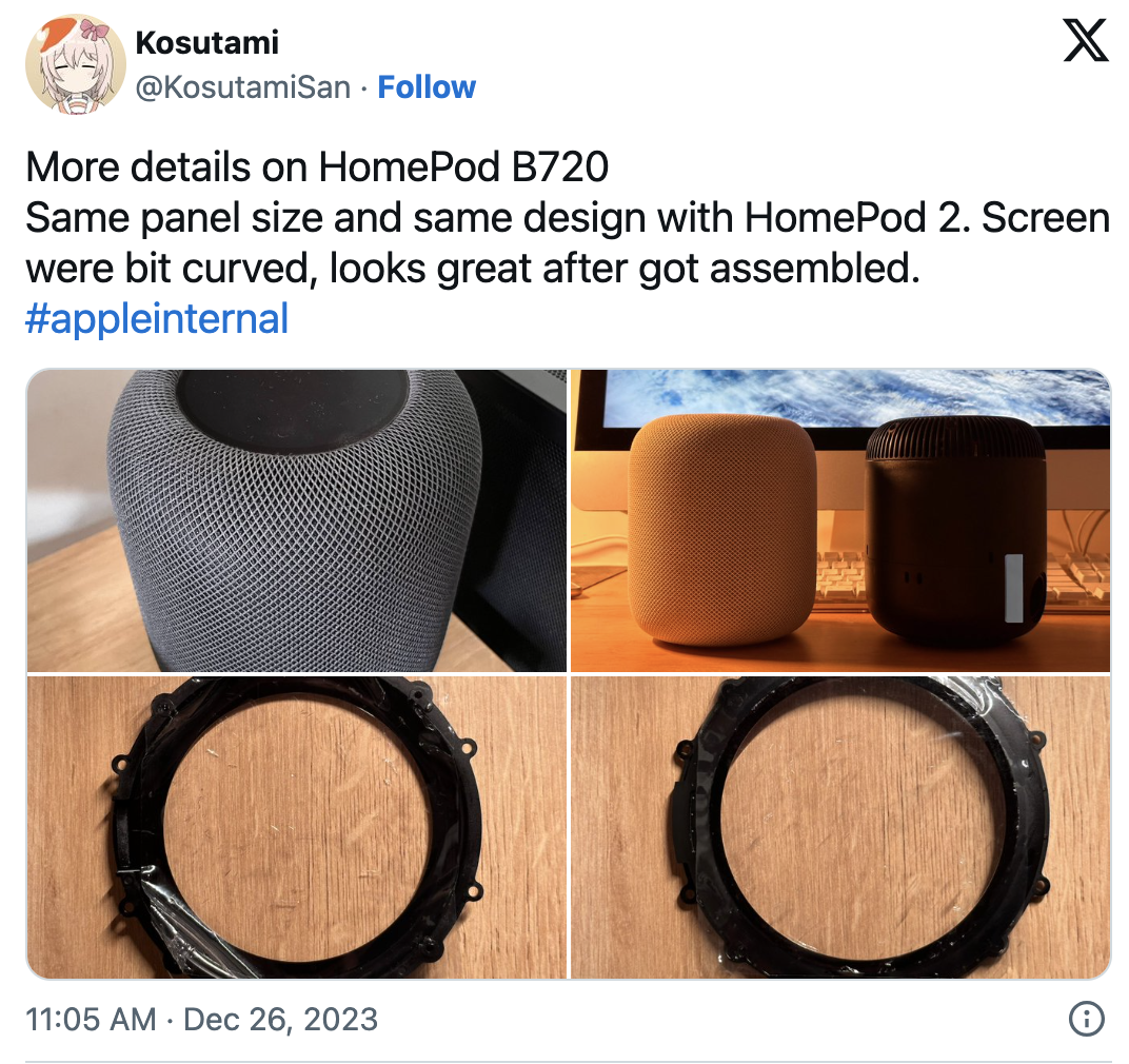 В октябре Kosutami обнародовал изображения компонентов, которые, вероятно, входят в состав прототипа сенсорного экрана HomePod. Другие источники того времени подтверждали подлинность этих изображений.