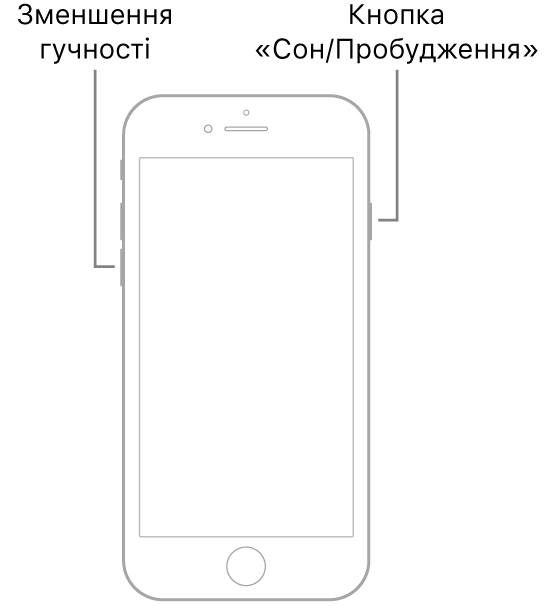 У iPhone 7 для перезавантаження необхідно одночасно натиснути та утримувати кнопку пробудження та клавішу гучності, тиснемо на стороні зменшення звуку.