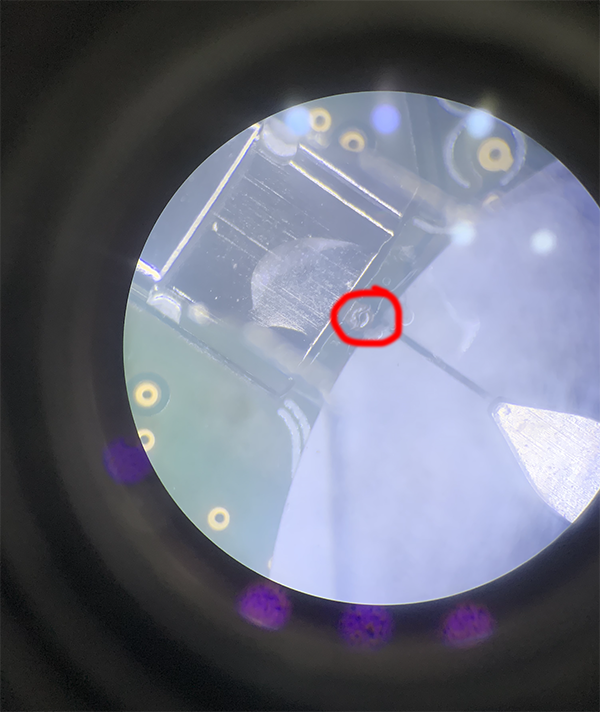 На фото з мікроскопа показаний той самий п'ятак, який ламається при заміні батарейки і пульт перестає працювати. Для ремонту брелока достатньо його пропаяти і на цьому ремонт можна вважати закінченим.