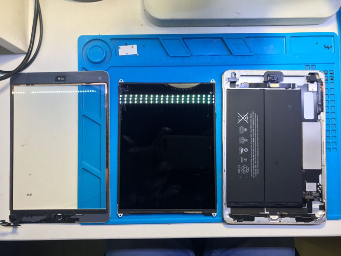 Приступаємо до розбирання Mini 2. Спочатку слід нагріти та відклеїти тачскрин. Заводський скотч дуже важко відклеюється від корпусу, у таких випадках використовується нагрівальна платформа або "сепаратор".